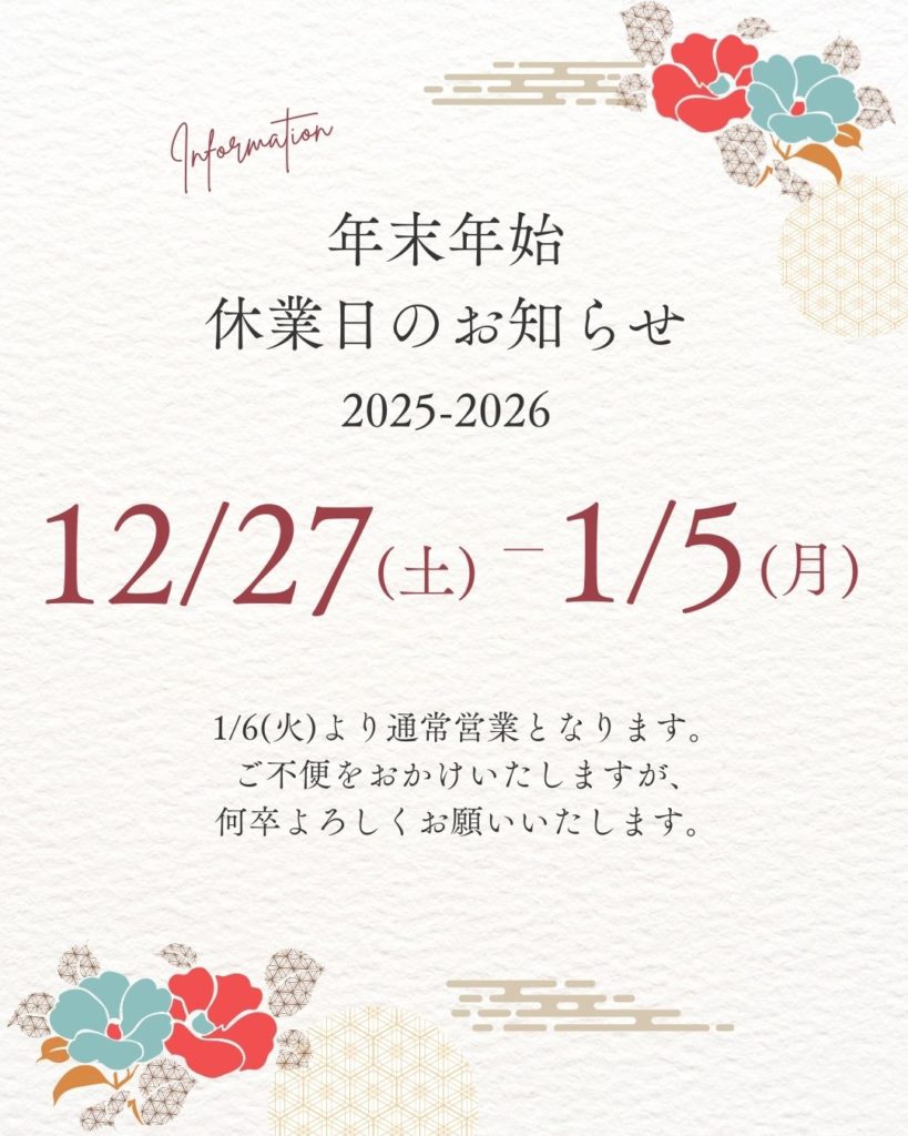 NEWS お知らせ ホーム お知らせ 年末年始休業のお知らせと年末のご挨拶 ニュース・告知 2025.12.01 年末年始休業のお知らせと年末のご挨拶 本年も格別のご愛顧を賜り、誠にありがとうございました。 多くのお客様との出会いに、心より感謝申し上げます。来年も、より良いご縁を大切にしながら、さらなるサービス向上に邁進してまいりますので、変わらぬご愛顧のほどよろしくお願いいたします。 さて、誠に勝手ながら年末年始の休業予定につきまして、下記の通りご案内申し上げます。 【年末年始休業期間】12月27日(土)~1月5日(月)※1月6日(火)より通常営業いたします。 皆様どうぞ良い年をお迎えください。 Prev 一覧に戻る Next